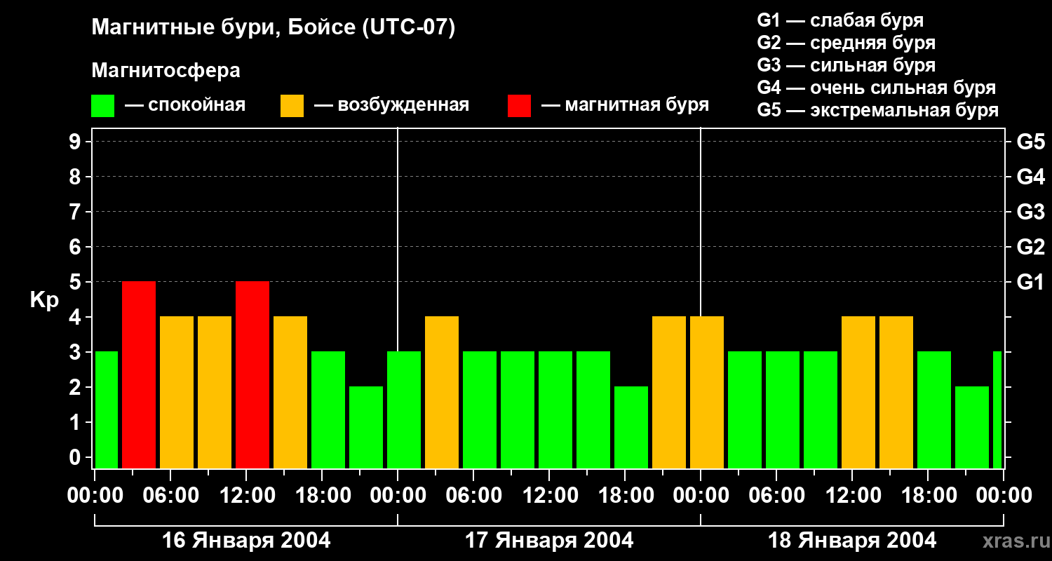 Изменения геомагнитного индекса Kp с 16 по 18 января 2004 года для средних широт