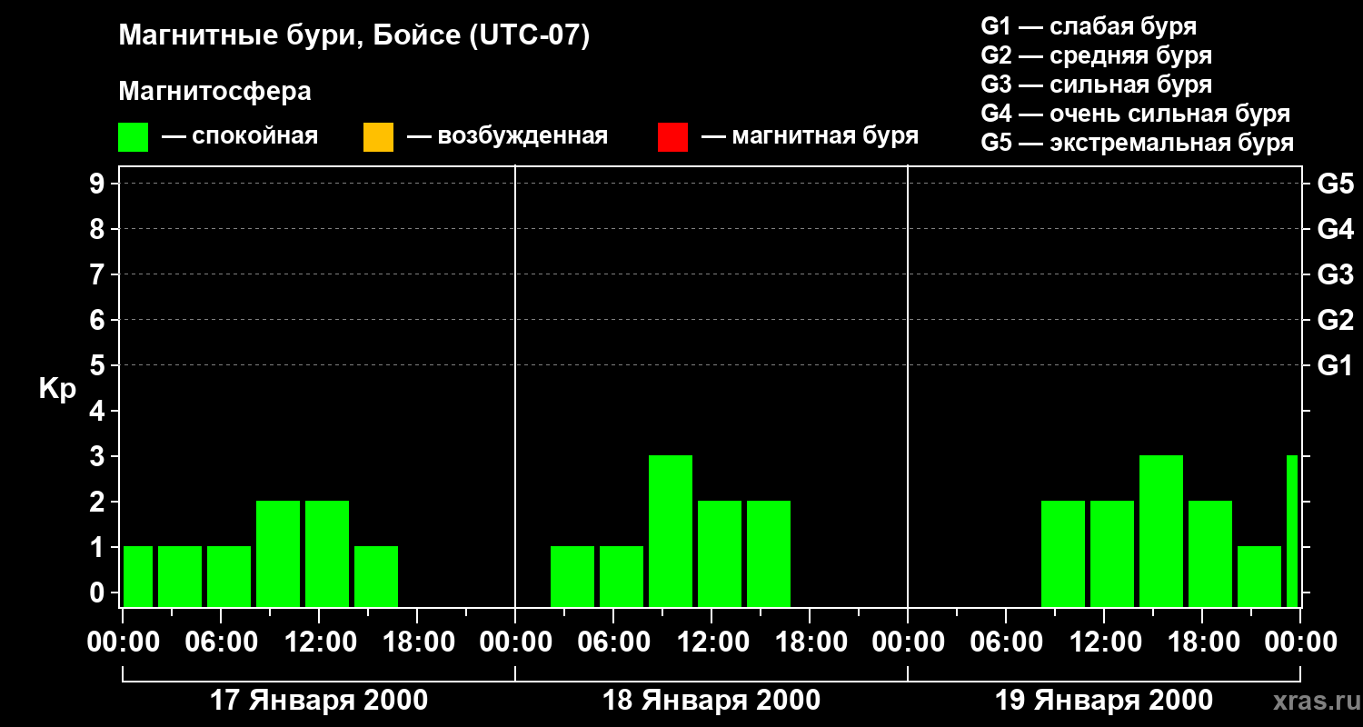 Изменения геомагнитного индекса Kp с 17 по 19 января 2000 года для средних широт