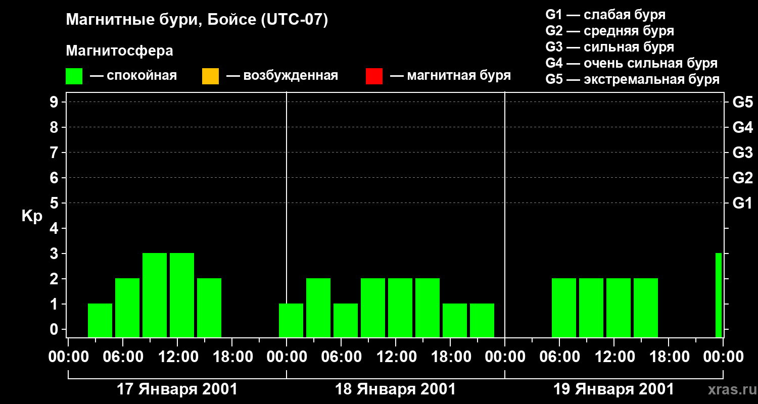 Изменения геомагнитного индекса Kp с 17 по 19 января 2001 года для средних широт