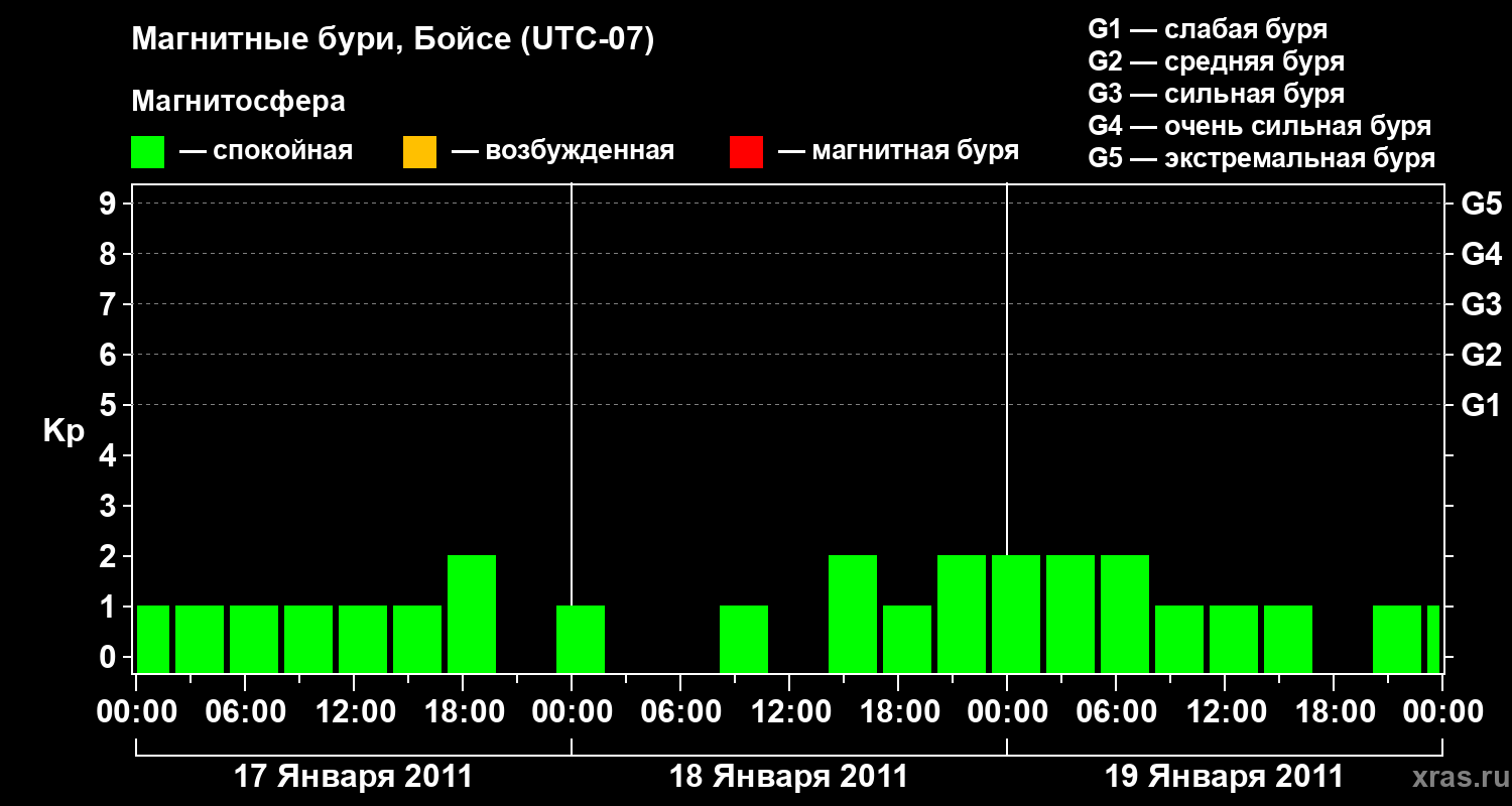 Изменения геомагнитного индекса Kp с 17 по 19 января 2011 года для средних широт