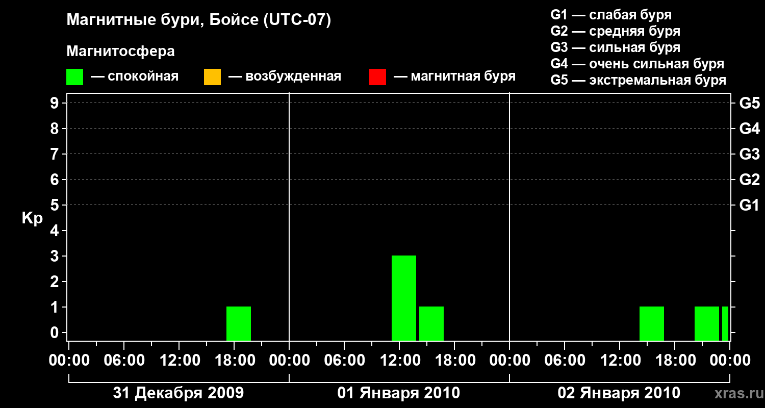 Изменения геомагнитного индекса Kp с 31 декабря 2009 года по 2 января 2010 года для средних широт