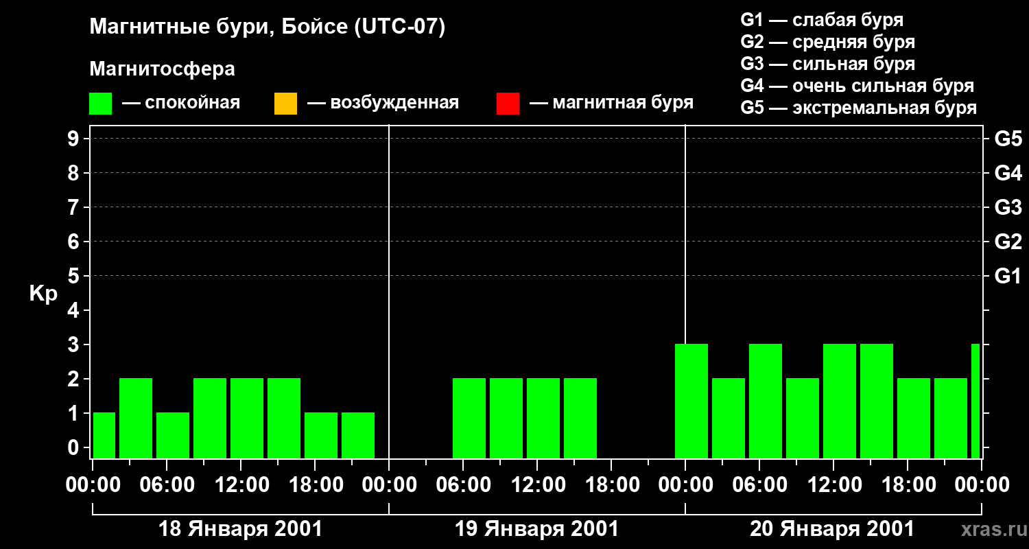 Изменения геомагнитного индекса Kp с 18 по 20 января 2001 года для средних широт