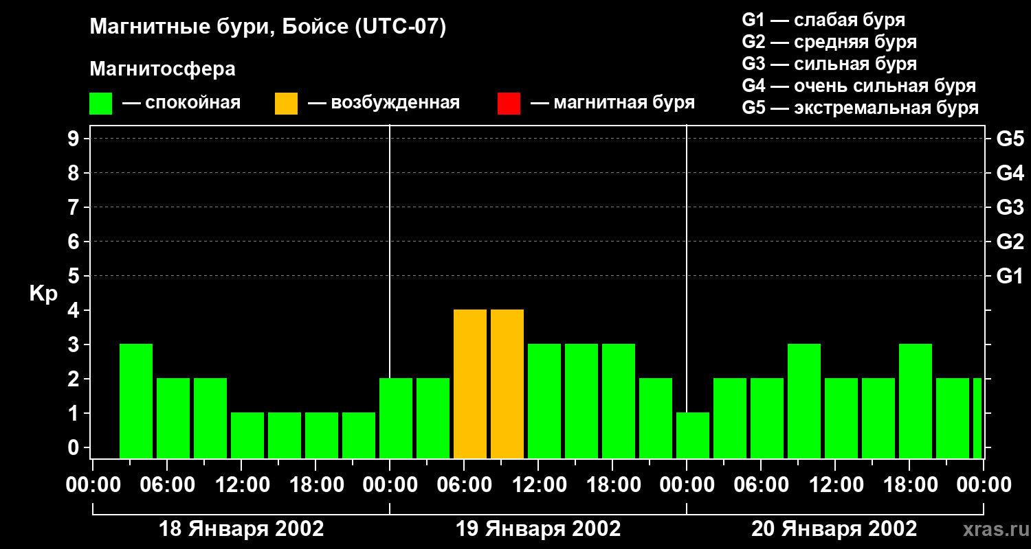 Изменения геомагнитного индекса Kp с 18 по 20 января 2002 года для средних широт