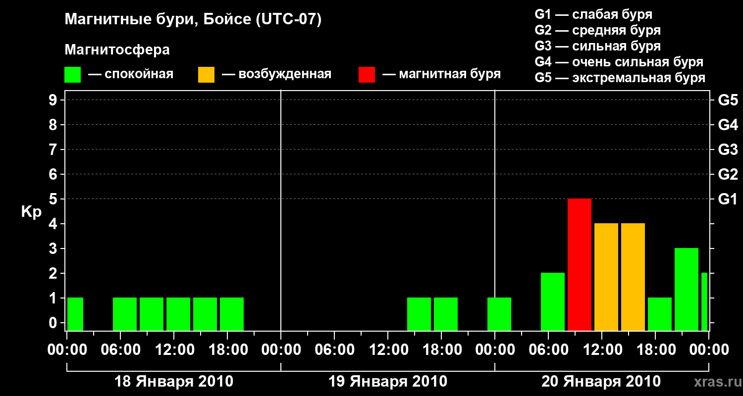 Изменения геомагнитного индекса Kp с 18 по 20 января 2010 года для средних широт