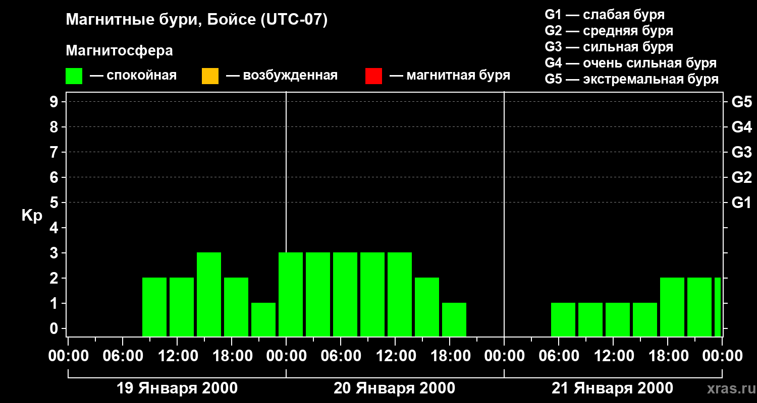 Изменения геомагнитного индекса Kp с 19 по 21 января 2000 года для средних широт