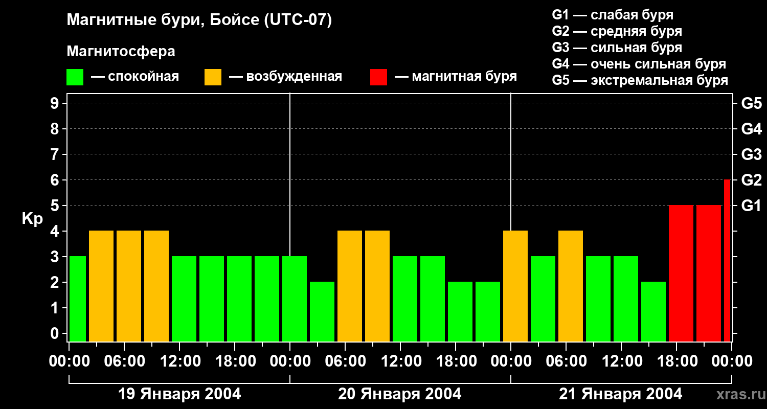 Изменения геомагнитного индекса Kp с 19 по 21 января 2004 года для средних широт