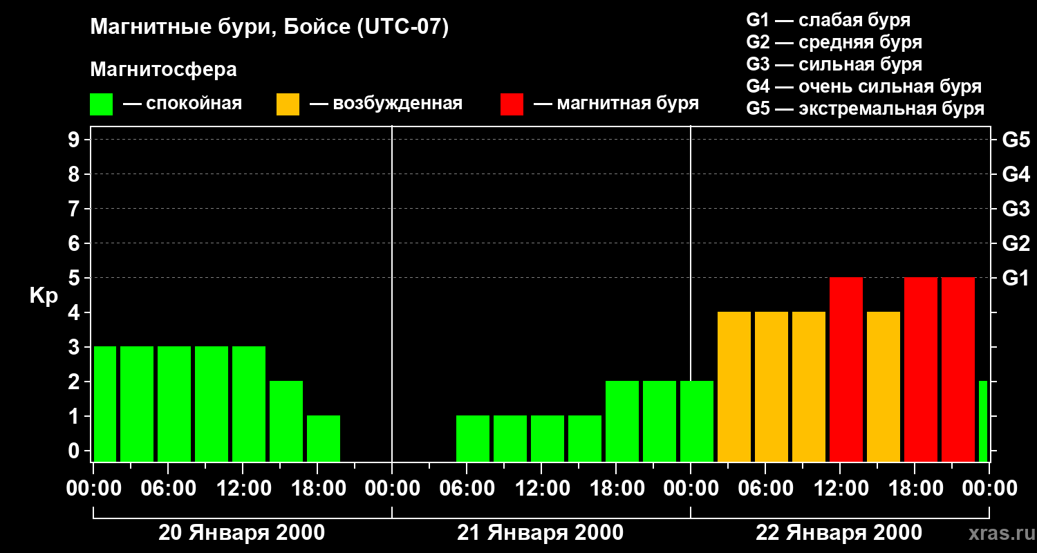 Изменения геомагнитного индекса Kp с 20 по 22 января 2000 года для средних широт