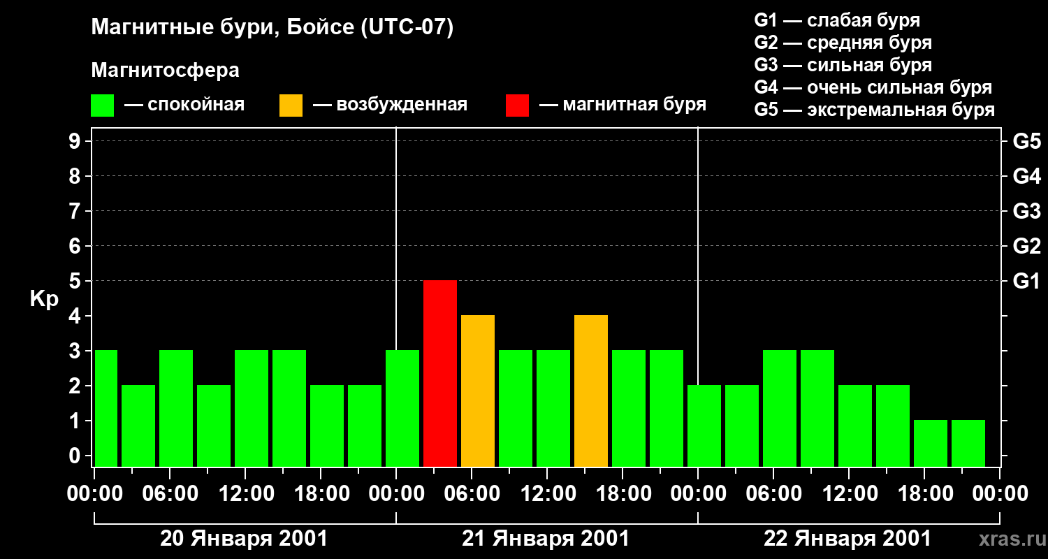 Изменения геомагнитного индекса Kp с 20 по 22 января 2001 года для средних широт