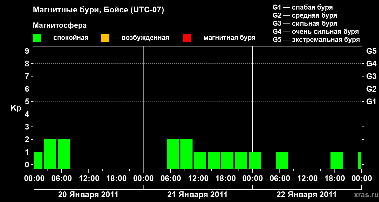 Изменения геомагнитного индекса Kp с 20 по 22 января 2011 года для средних широт
