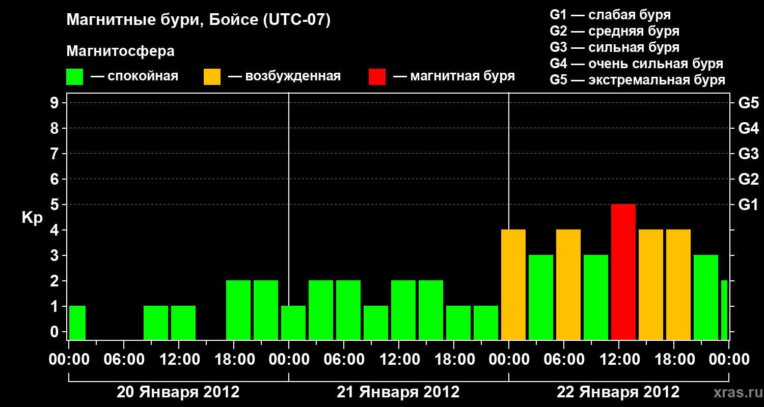 Изменения геомагнитного индекса Kp с 20 по 22 января 2012 года для средних широт