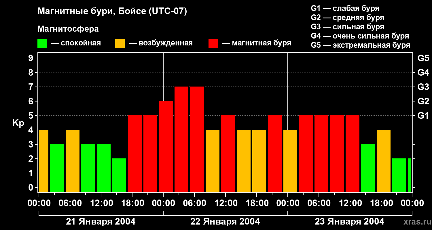 Изменения геомагнитного индекса Kp с 21 по 23 января 2004 года для средних широт