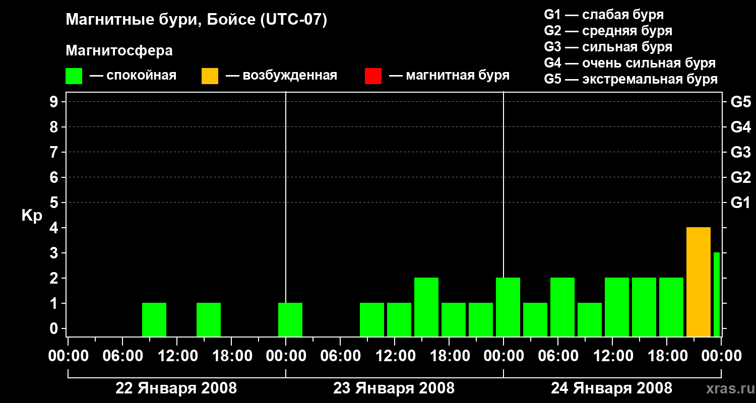 Изменения геомагнитного индекса Kp с 22 по 24 января 2008 года для средних широт