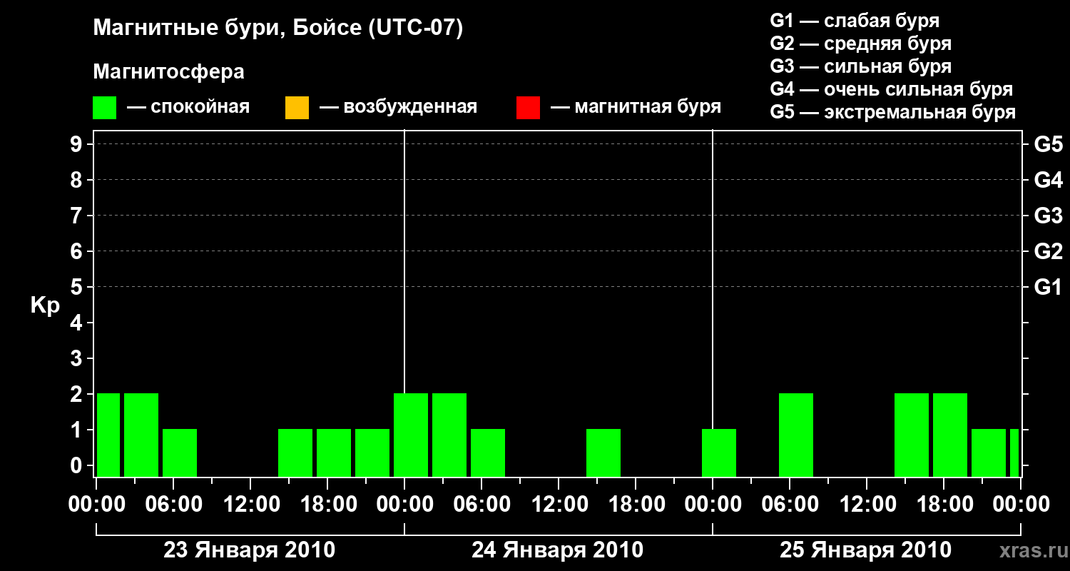 Изменения геомагнитного индекса Kp с 23 по 25 января 2010 года для средних широт