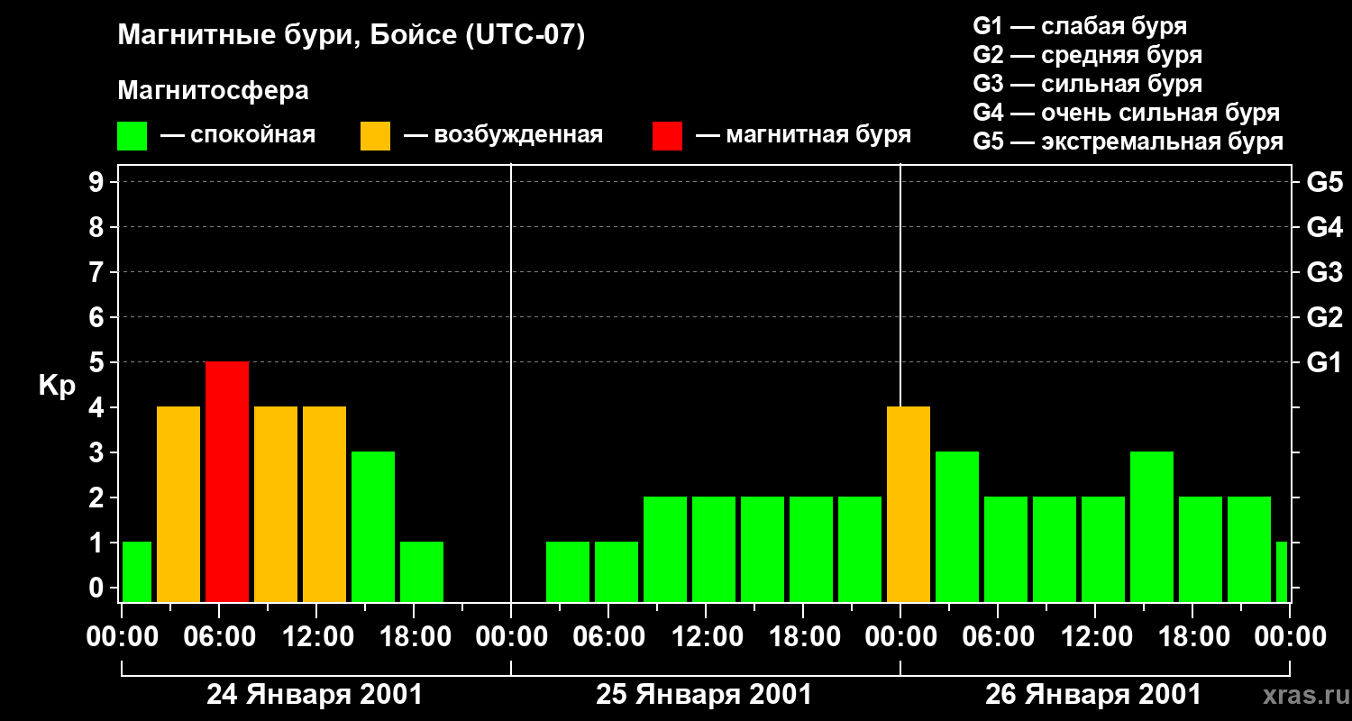 Изменения геомагнитного индекса Kp с 24 по 26 января 2001 года для средних широт