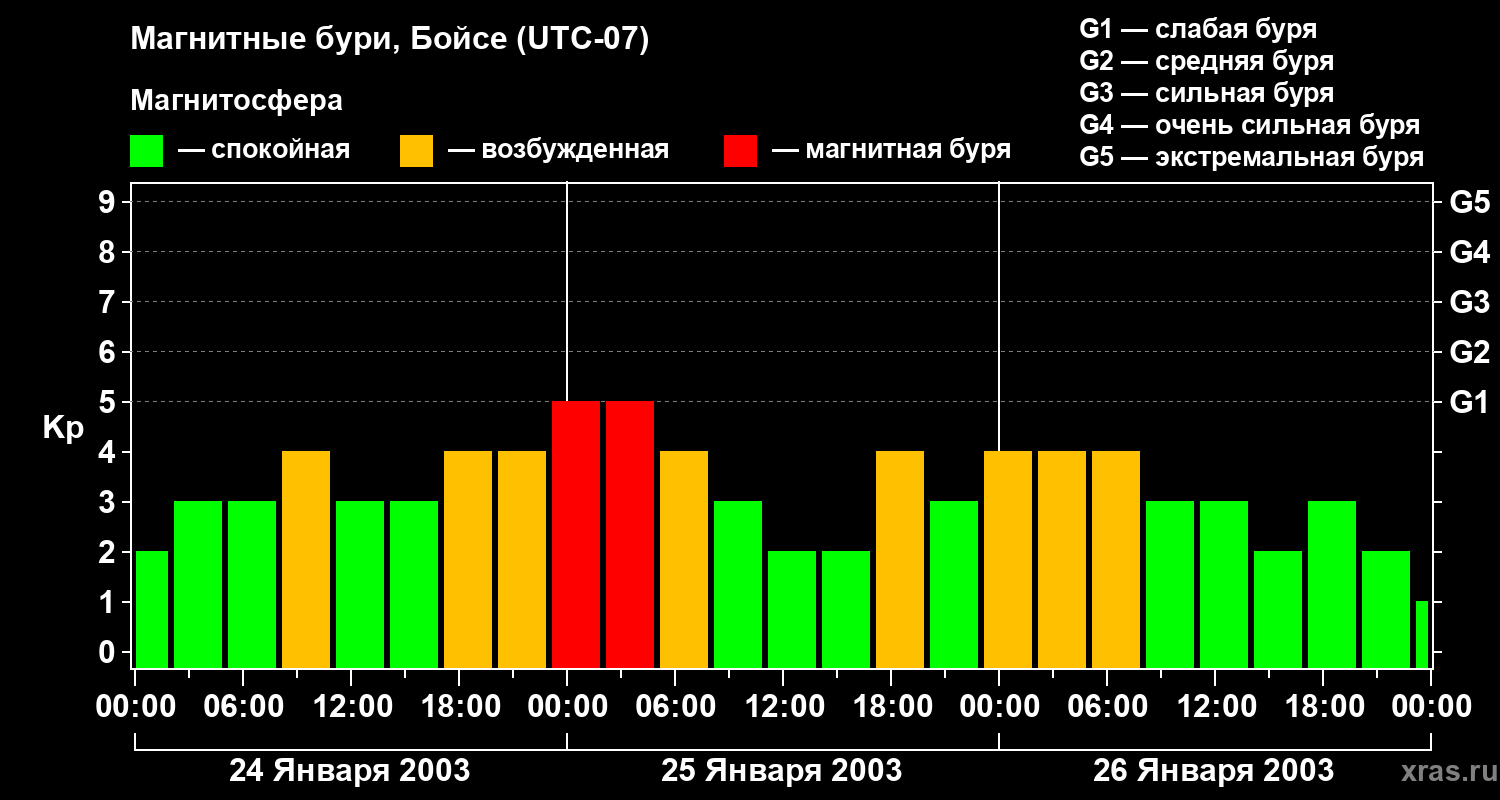 Изменения геомагнитного индекса Kp с 24 по 26 января 2003 года для средних широт