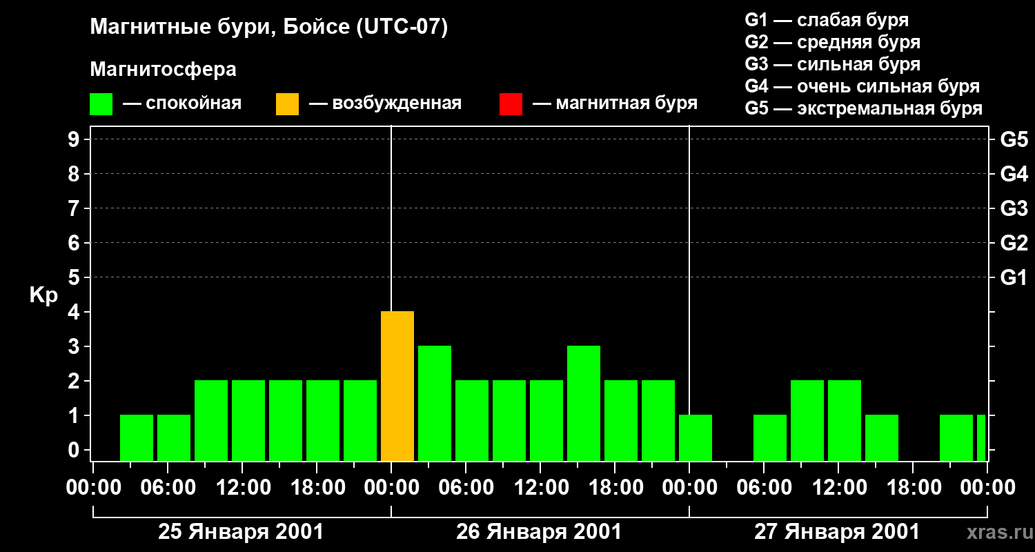 Изменения геомагнитного индекса Kp с 25 по 27 января 2001 года для средних широт