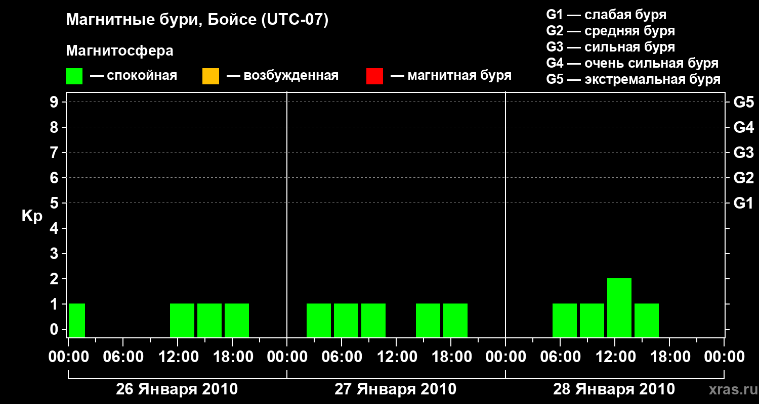 Изменения геомагнитного индекса Kp с 26 по 28 января 2010 года для средних широт