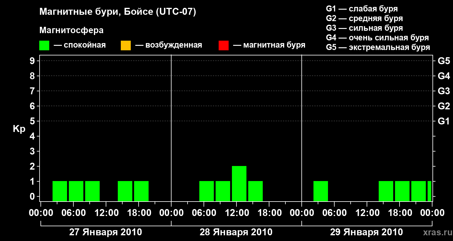 Изменения геомагнитного индекса Kp с 27 по 29 января 2010 года для средних широт
