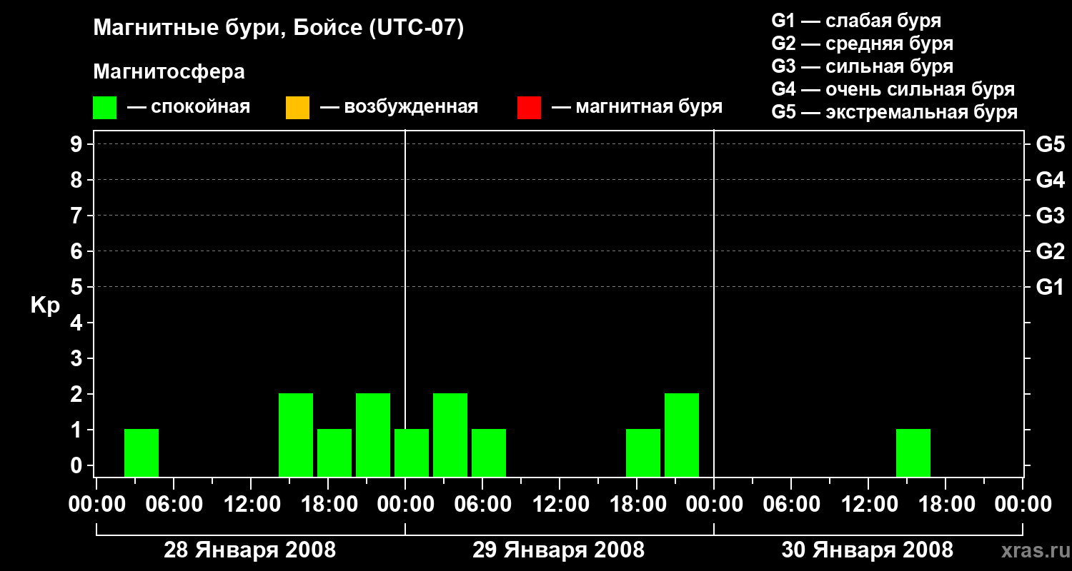Изменения геомагнитного индекса Kp с 28 по 30 января 2008 года для средних широт
