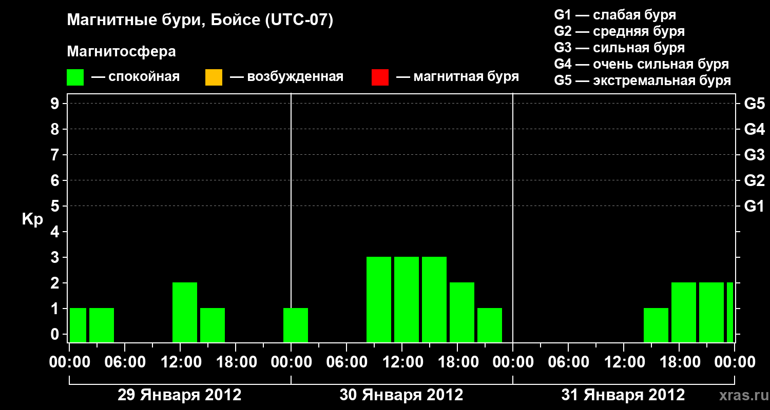 Изменения геомагнитного индекса Kp с 29 по 31 января 2012 года для средних широт