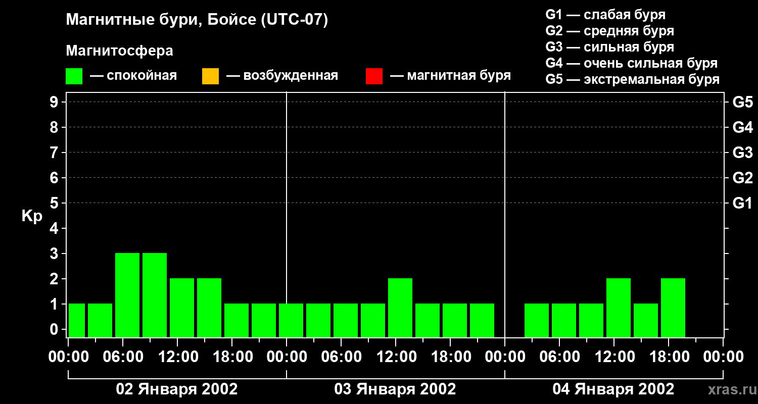 Изменения геомагнитного индекса Kp с 2 по 4 января 2002 года для средних широт