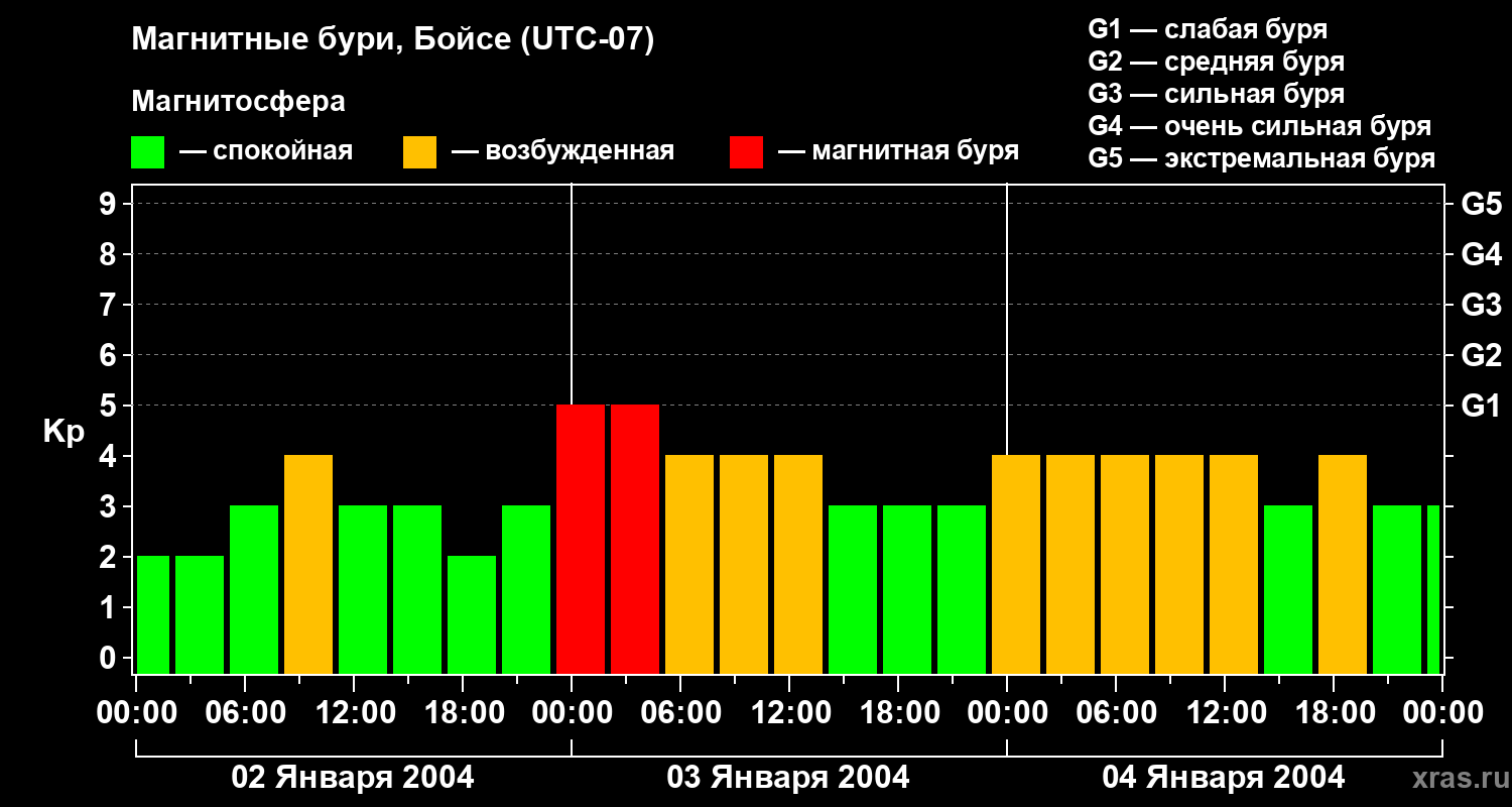 Изменения геомагнитного индекса Kp с 2 по 4 января 2004 года для средних широт