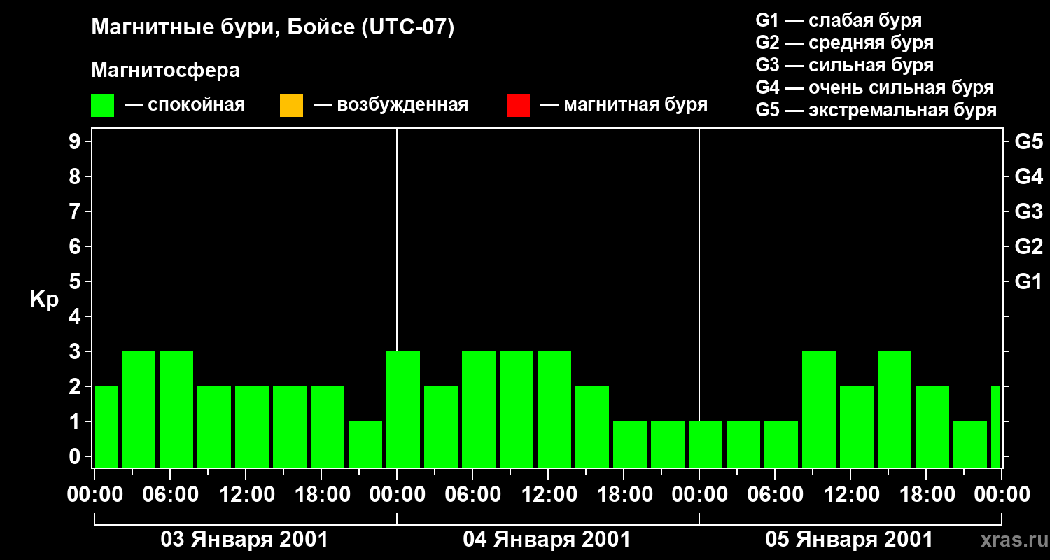 Изменения геомагнитного индекса Kp с 3 по 5 января 2001 года для средних широт