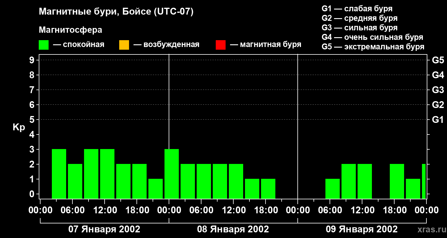 Изменения геомагнитного индекса Kp с 7 по 9 января 2002 года для средних широт
