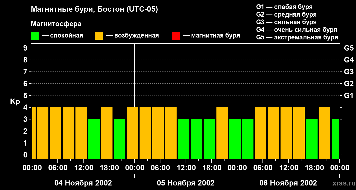 Изменения геомагнитного индекса Kp с 4 по 6 ноября 2002 года для средних широт