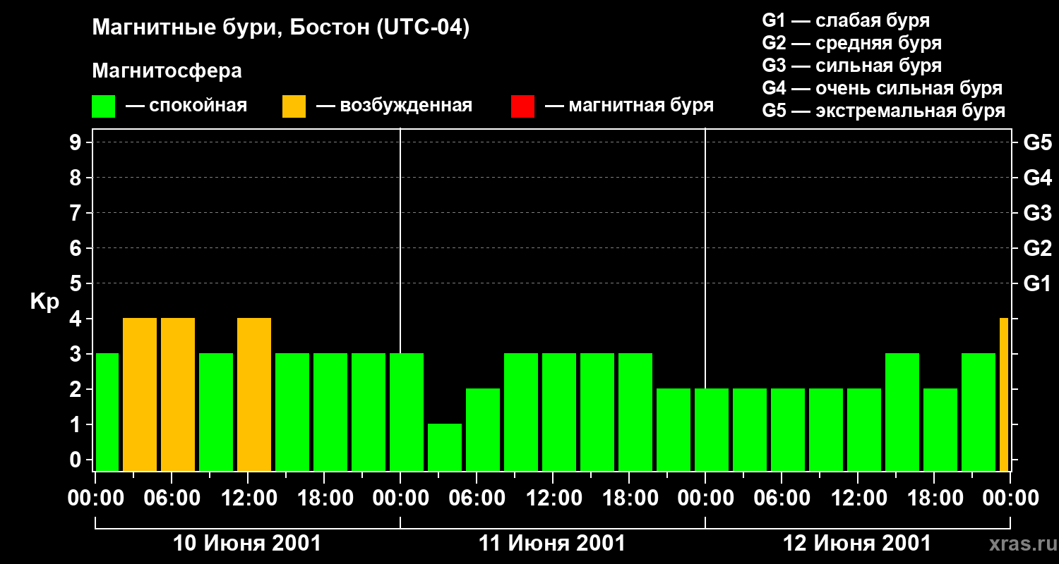 Изменения геомагнитного индекса Kp с 10 по 12 июня 2001 года для средних широт