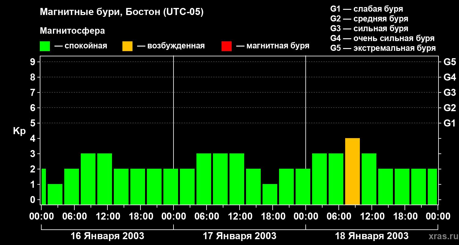 Изменения геомагнитного индекса Kp с 16 по 18 января 2003 года для средних широт