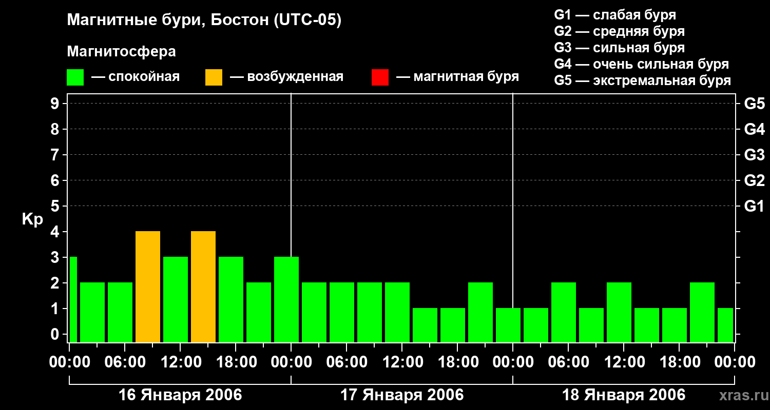 Изменения геомагнитного индекса Kp с 16 по 18 января 2006 года для средних широт