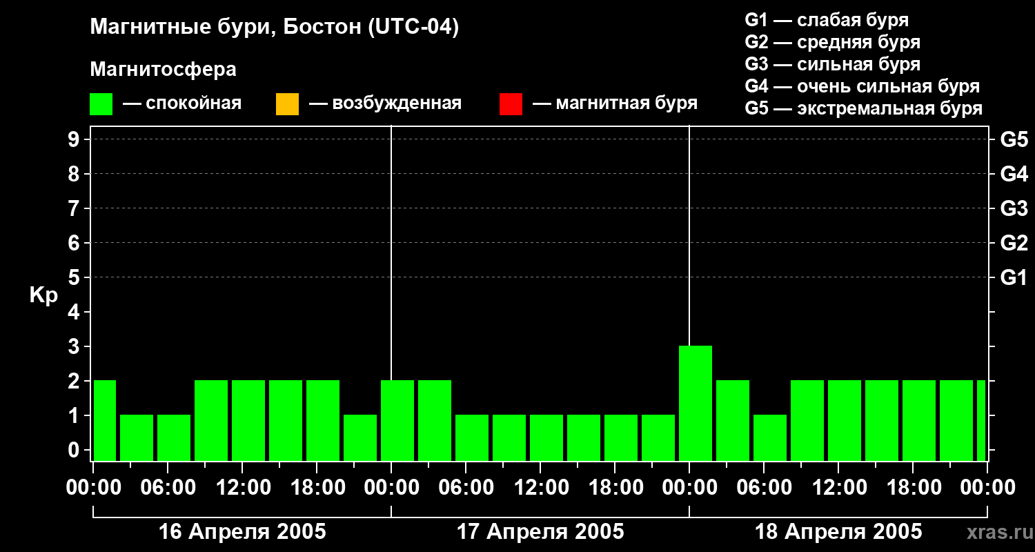 Изменения геомагнитного индекса Kp с 16 по 18 апреля 2005 года для средних широт