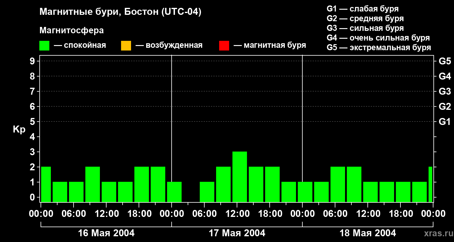 Изменения геомагнитного индекса Kp с 16 по 18 мая 2004 года для средних широт