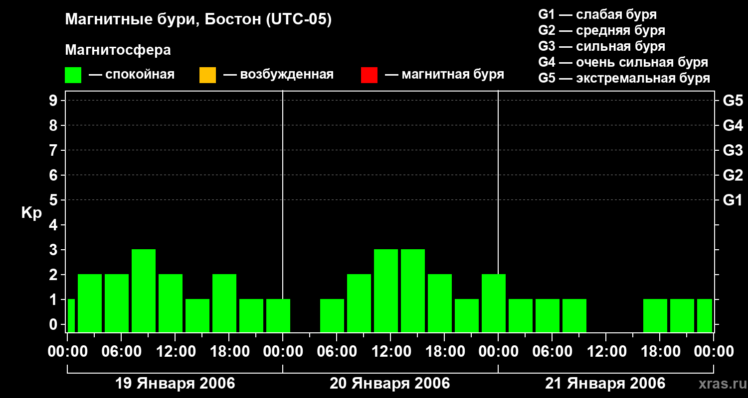 Изменения геомагнитного индекса Kp с 19 по 21 января 2006 года для средних широт