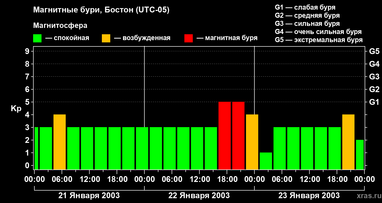 Изменения геомагнитного индекса Kp с 21 по 23 января 2003 года для средних широт