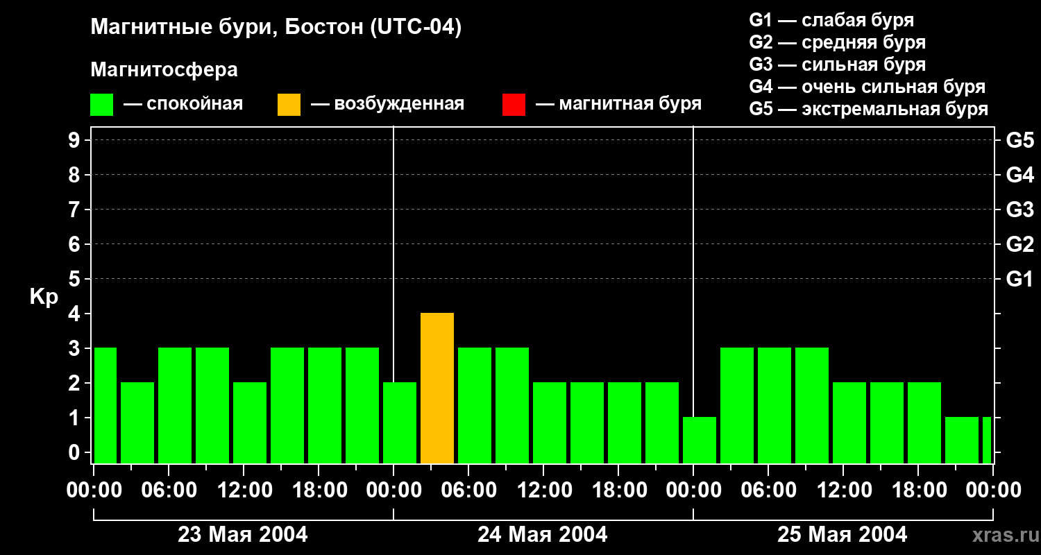 Изменения геомагнитного индекса Kp с 23 по 25 мая 2004 года для средних широт