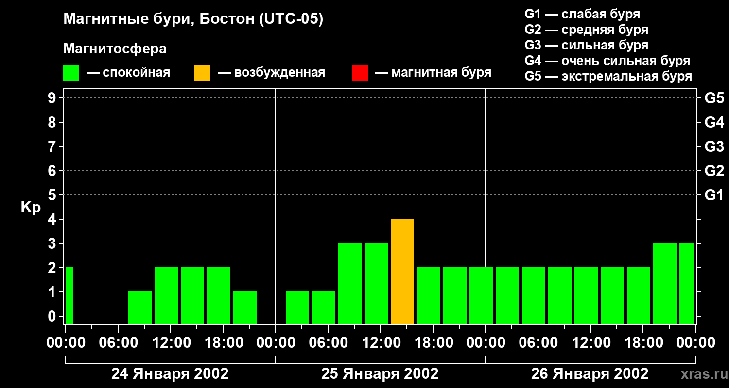 Изменения геомагнитного индекса Kp с 24 по 26 января 2002 года для средних широт