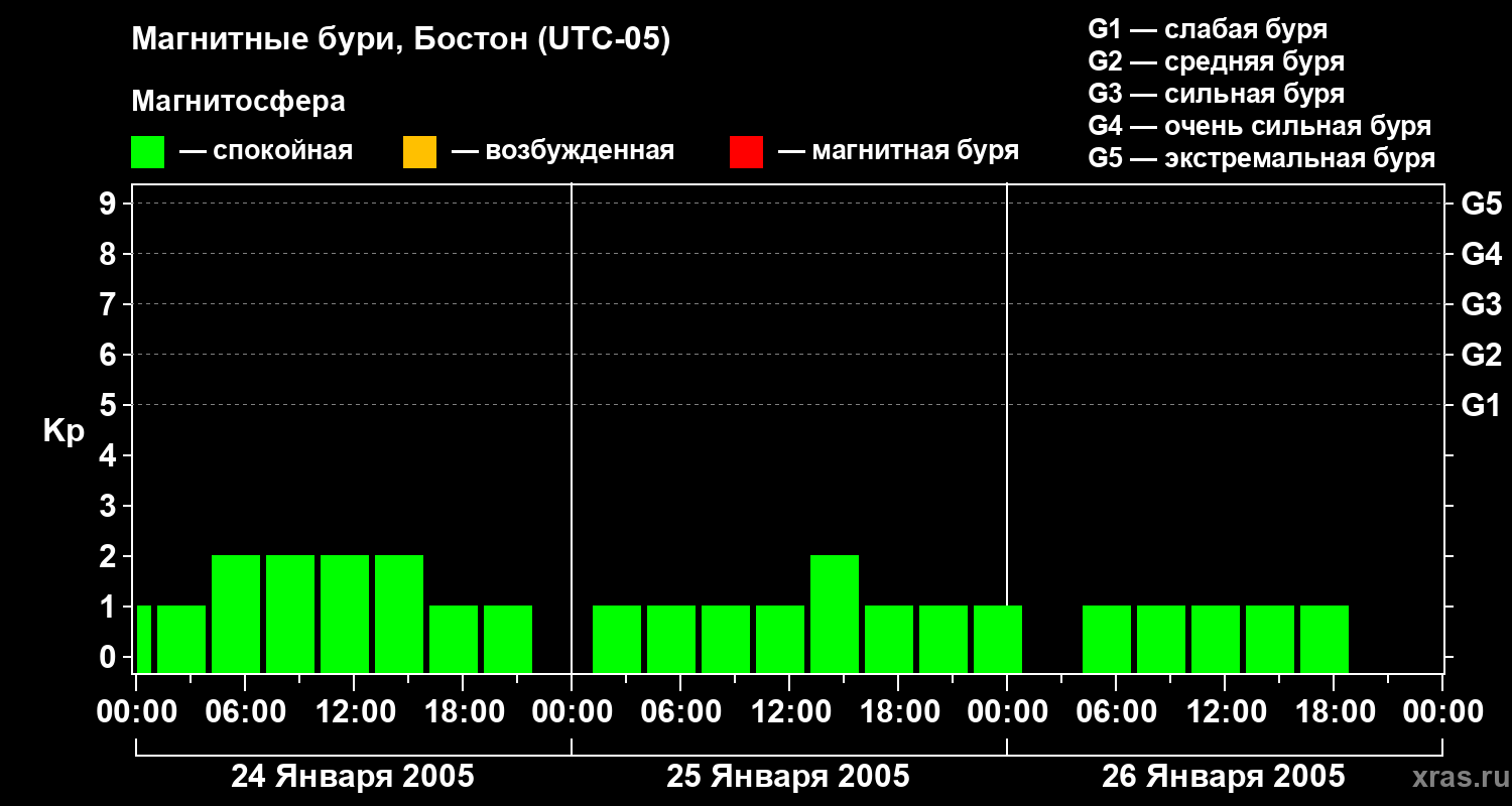 Изменения геомагнитного индекса Kp с 24 по 26 января 2005 года для средних широт