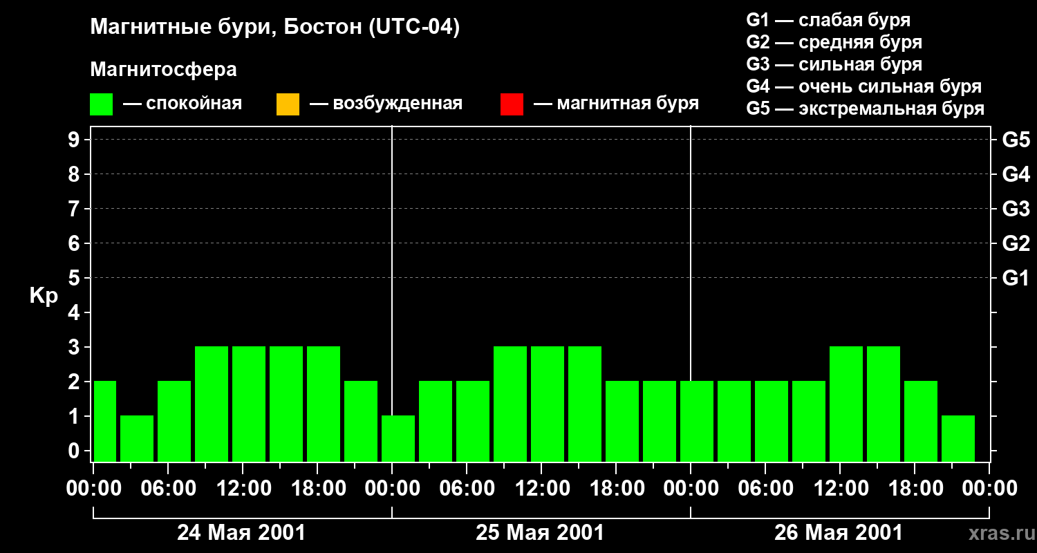 Изменения геомагнитного индекса Kp с 24 по 26 мая 2001 года для средних широт