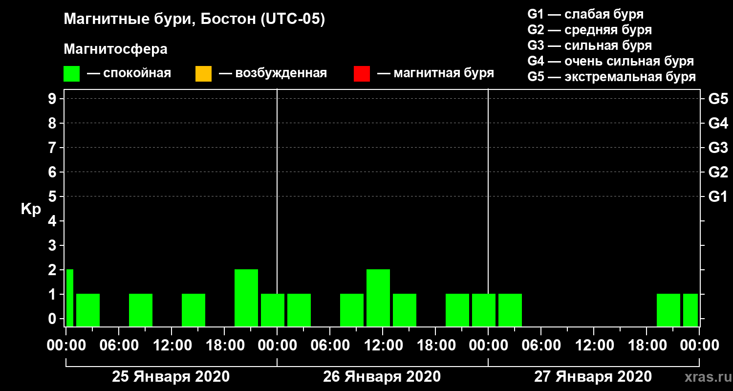 Изменения геомагнитного индекса Kp с 25 по 27 января 2020 года для средних широт