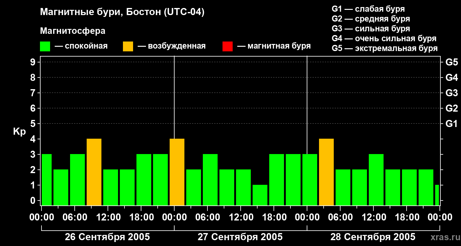Изменения геомагнитного индекса Kp с 26 по 28 сентября 2005 года для средних широт