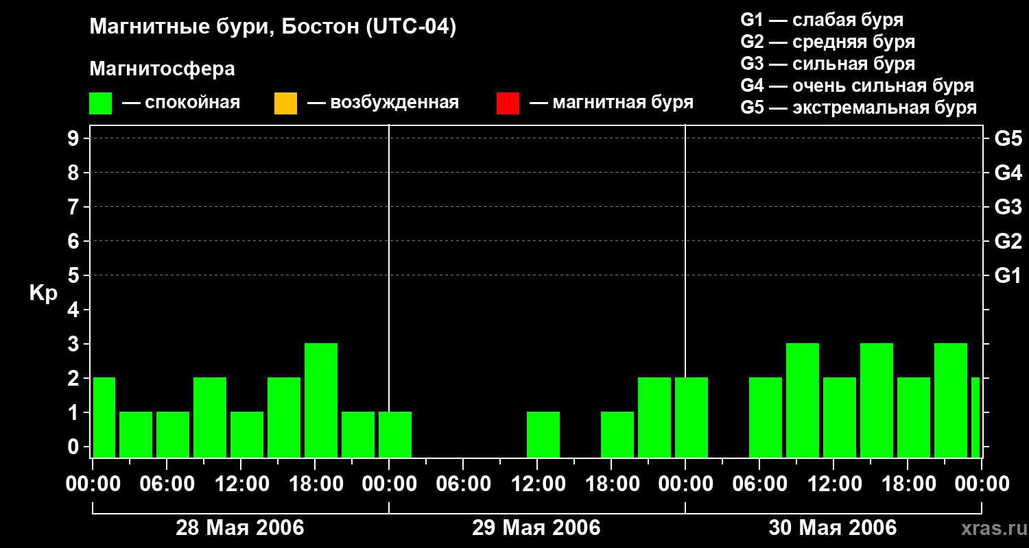 Изменения геомагнитного индекса Kp с 28 по 30 мая 2006 года для средних широт