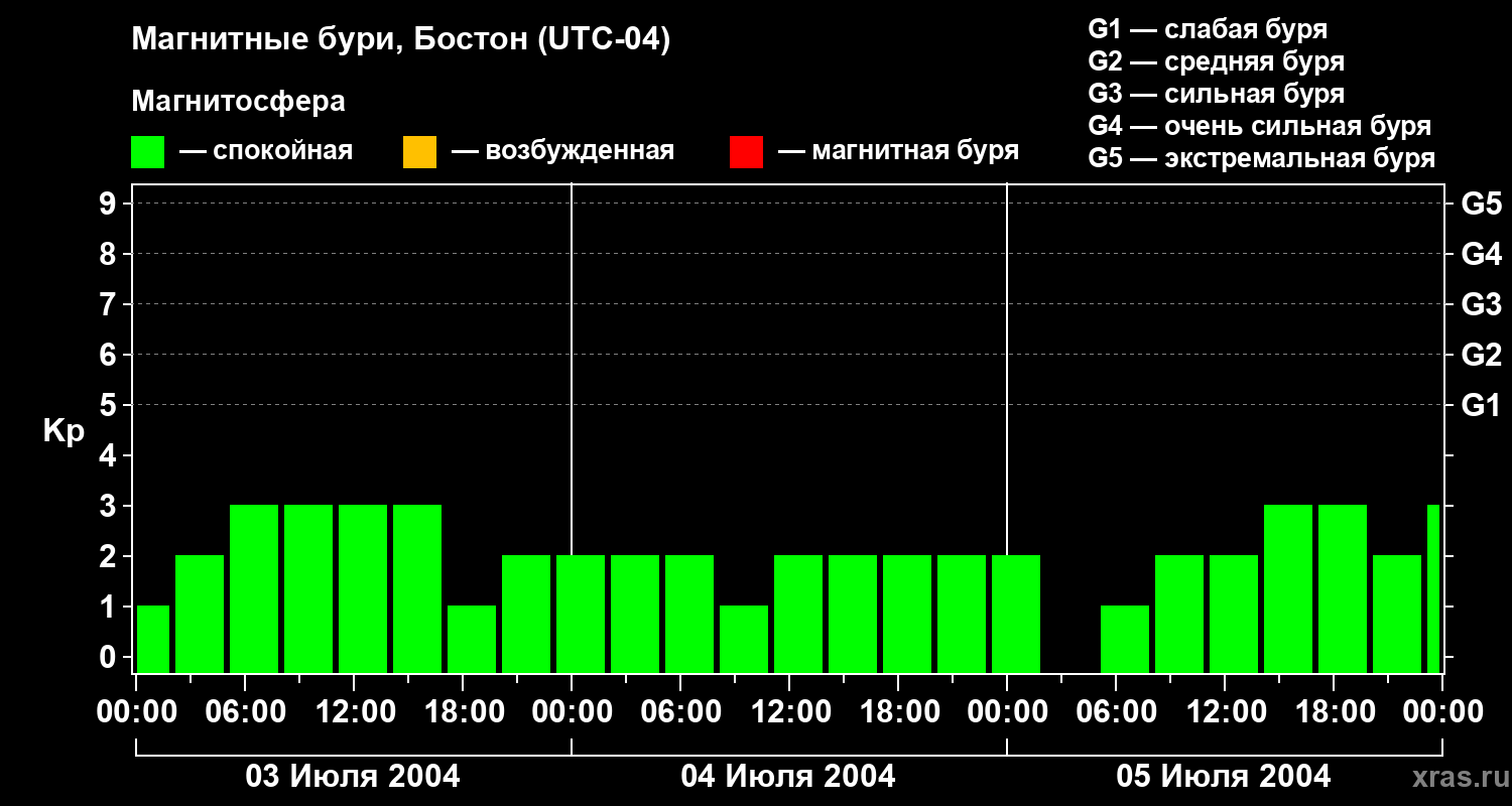 Изменения геомагнитного индекса Kp с 3 по 5 июля 2004 года для средних широт