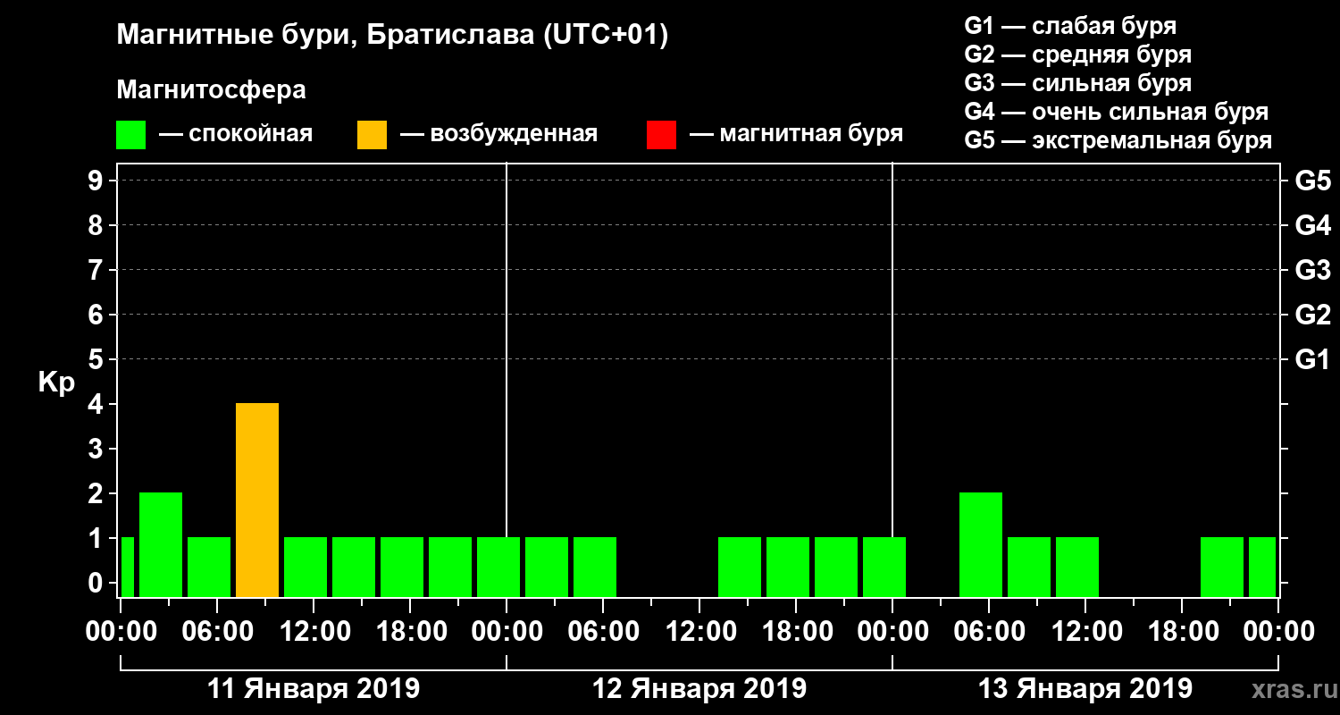 Изменения геомагнитного индекса Kp с 11 по 13 января 2019 года для средних широт