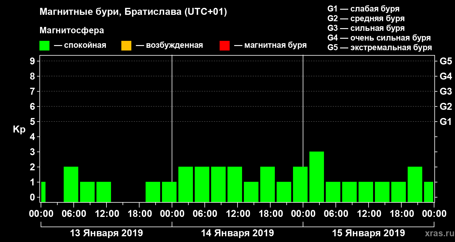 Изменения геомагнитного индекса Kp с 13 по 15 января 2019 года для средних широт