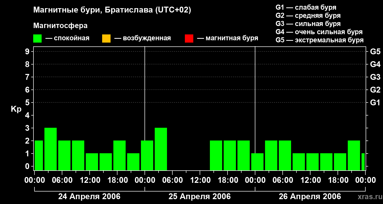 Изменения геомагнитного индекса Kp с 24 по 26 апреля 2006 года для средних широт