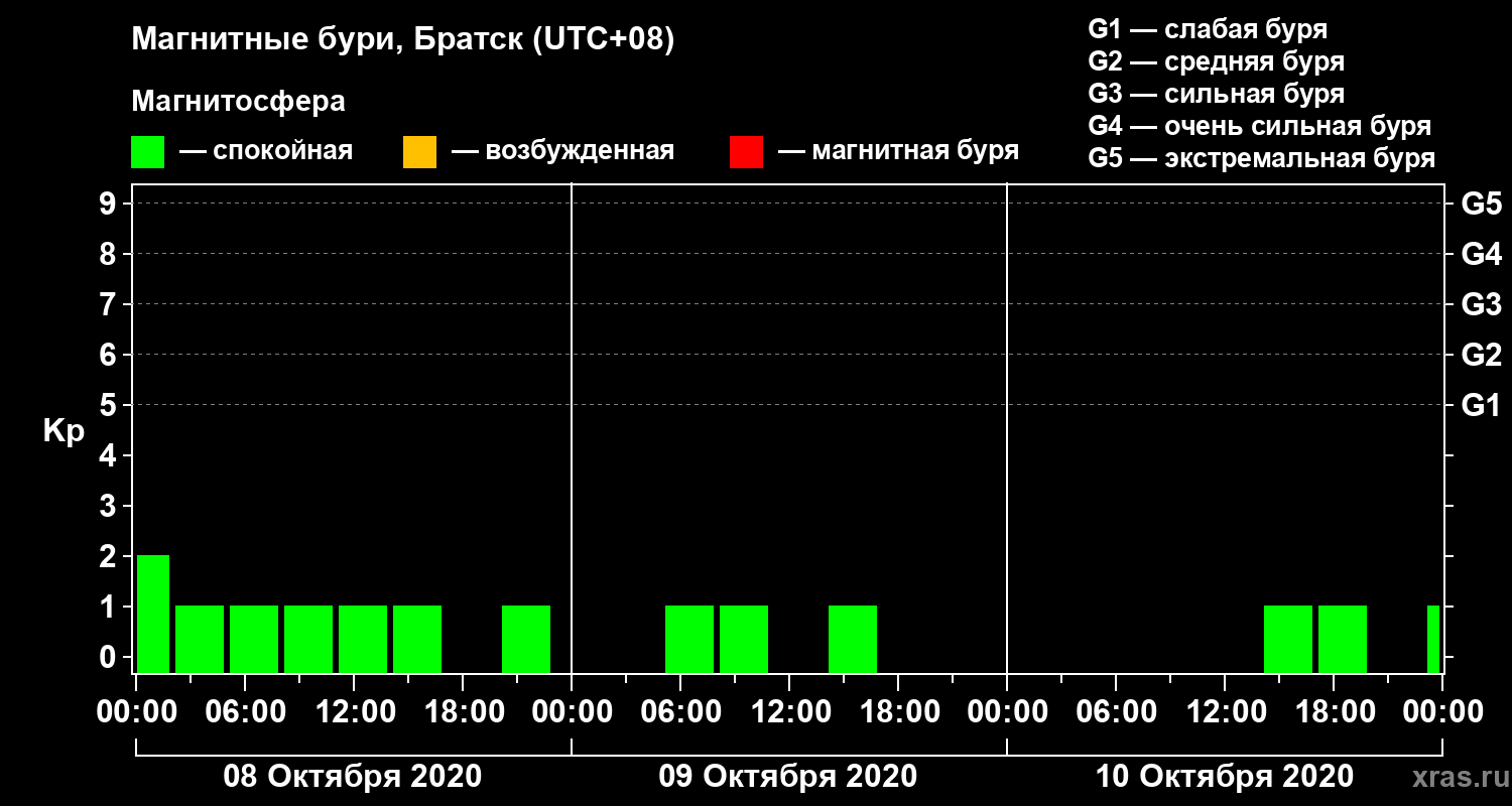 Изменения геомагнитного индекса Kp с 8 по 10 октября 2020 года для средних широт