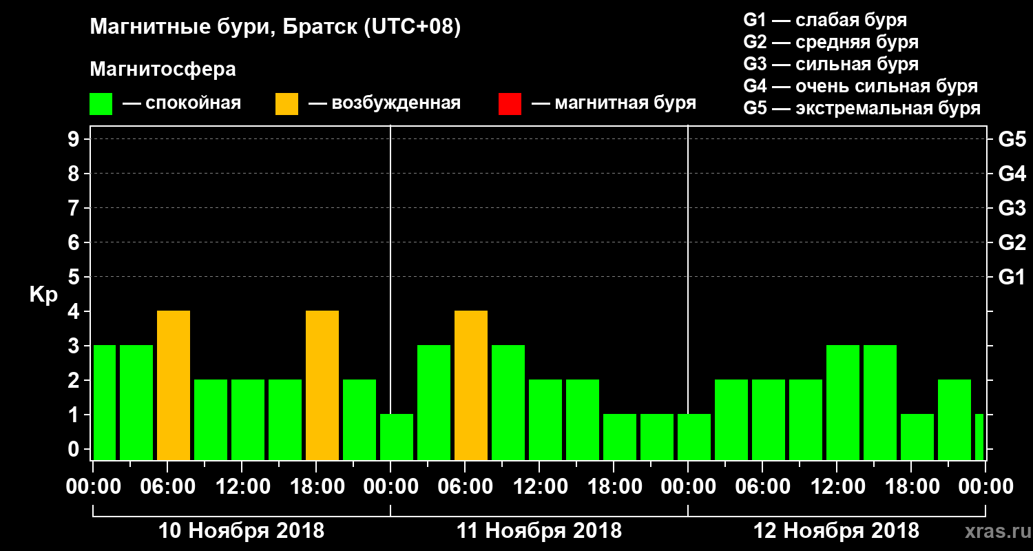 Изменения геомагнитного индекса Kp с 10 по 12 ноября 2018 года для средних широт