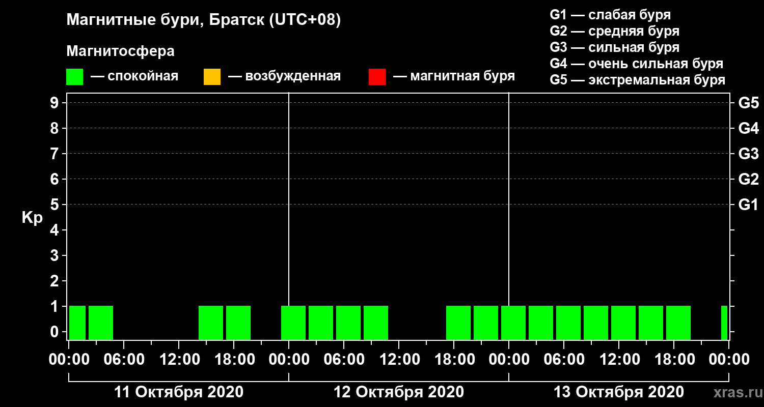 Изменения геомагнитного индекса Kp с 11 по 13 октября 2020 года для средних широт